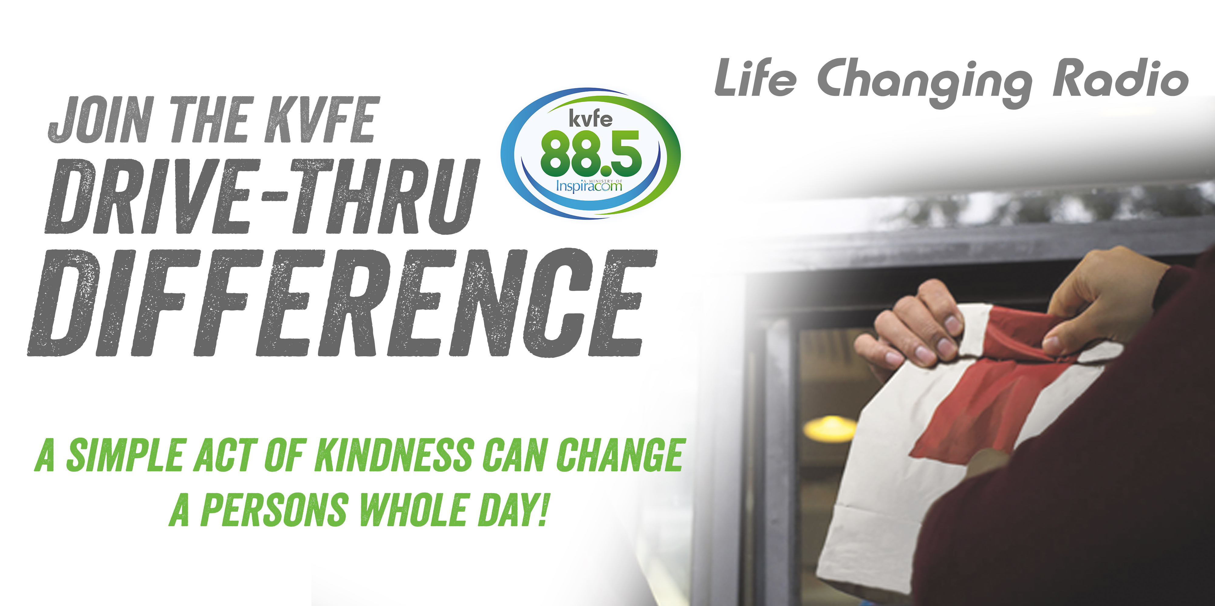 We thought it would be a great time to start our “KVFE Drive-Thru Difference” campaign. We want to thank the Lord for all our many blessings by blessing those around us in our daily activities. We have cards for you to use at your discretion when going through any drive-thru business (at a fast food place, coffee shop, or even when you pick up an order to go!).